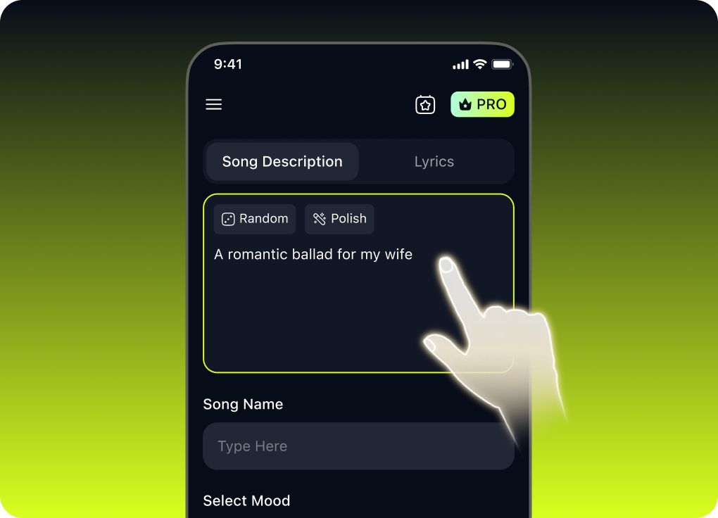 Enter a simple prompt like "a romantic ballad for my wife" or "an energetic workout song." Our song lyrics singer AI understands your vision and gets to work immediately.