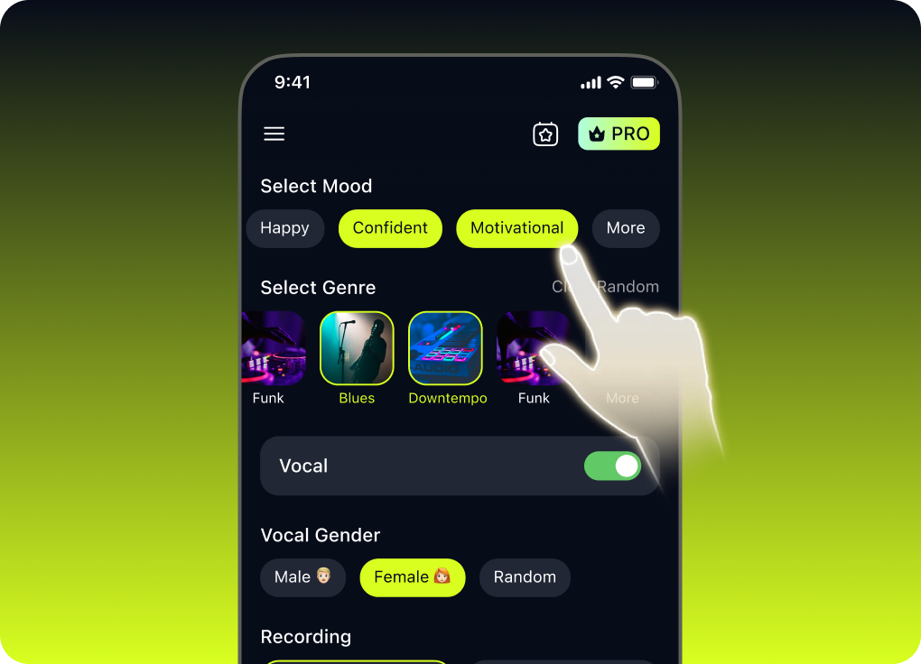 From AI country songs to hip-hop beats, pop anthems to jazz ballads. Create song online in any style you imagine. Want a song with lyrics or make song instrumental? Both options available.